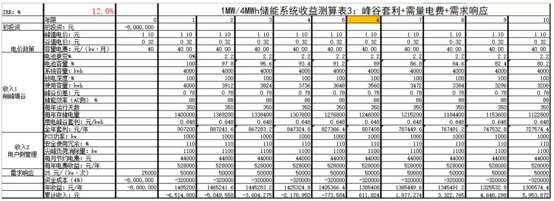 表格4是測算結(jié)果,內(nèi)部收益率IRR=21.9%,回收期4年,,如果將容量改為1MW/3MWh一下,可實(shí)現(xiàn)當(dāng)年盈利,相信這種項(xiàng)目也會是資本眼中的肥肉,搞儲能融資租賃的朋友,見此項(xiàng)目也應(yīng)該毫不猶豫地?cái)M合同了,畢竟這個是需求側(cè)儲能的亮點(diǎn),你只需拿出充足的數(shù)據(jù),讓業(yè)主放心地掏出初始擴(kuò)容費(fèi)。