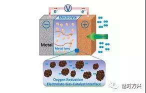 可直接再充式鋅空氣二次電池在運行過程中金屬鋅電極發(fā)生溶解或沉積,放電產物溶解在堿性電解液中;空氣中的氧氣在負載雙功能電催化劑的空氣電極中,進行氧還原(ORR)或氧析出(OER)電化學反應,完成電能與化學能相互可逆轉換。鋅空氣電池化學方程式如下: