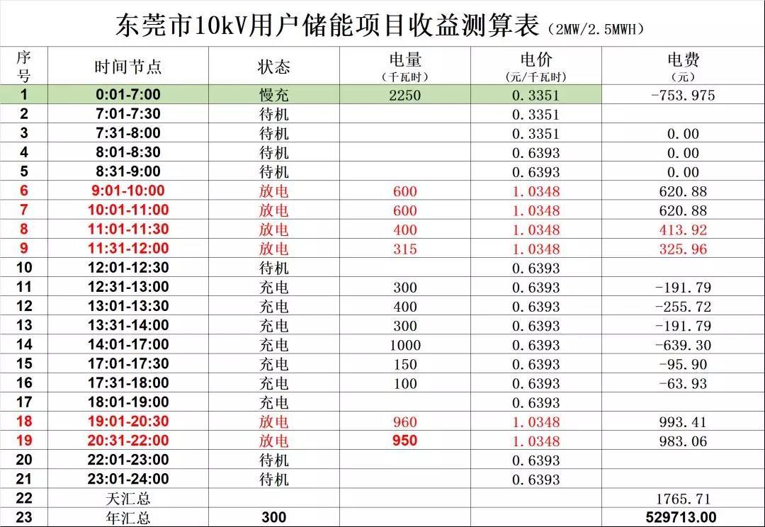 而在11:00-12:00是東莞市的高峰電價(jià)時(shí)間,這個(gè)時(shí)間段進(jìn)行充電,而在下午12:30開(kāi)始放電,該段時(shí)間為東莞市的平段電價(jià)時(shí)間,即便對(duì)充電補(bǔ)貼5毛錢(qián)/度電的補(bǔ)貼,其價(jià)差收益也較低。