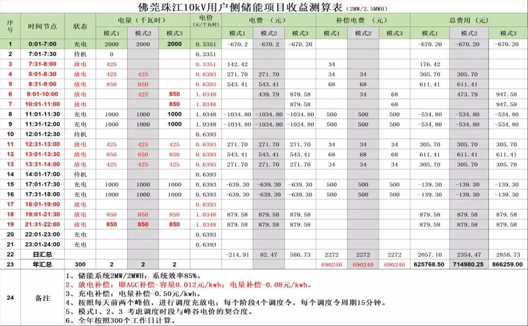 我們可以通過(guò)三種模式的經(jīng)濟(jì)性比較,來(lái)分析參加電力輔助服務(wù)的投資回報(bào)是否比原來(lái)兩次的調(diào)峰有所增長(zhǎng)。