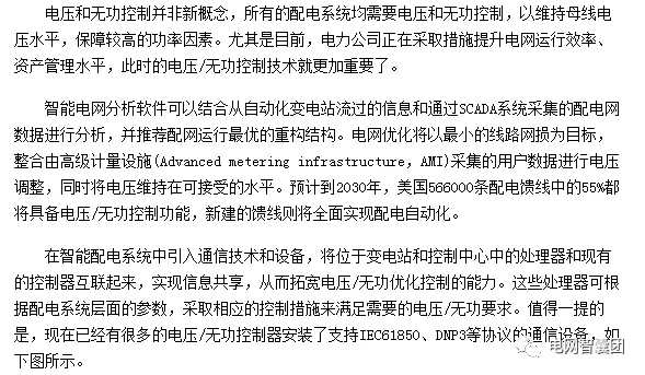 電氣工程專家認(rèn)為:未來配電網(wǎng)將在各個(gè)變電站之間使用高速寬芾通信系統(tǒng),利用智能電子設(shè)備(Intelligent electronic devices ,IEDs)進(jìn)行自適應(yīng)控制和保護(hù)。應(yīng)用能量管理系統(tǒng)監(jiān)測(cè)配電網(wǎng)的運(yùn)行狀況,并充分采用智能系統(tǒng)減少電能質(zhì)量問題和提高供電可靠性。