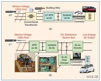 此外,EPRI還研發(fā)出了中壓智能通用變壓器(Intelligent Universal Transformer,IUT)。該技術(shù)替代了獨(dú)立的電能轉(zhuǎn)換器和傳統(tǒng)的變壓器,完全摒棄了傳統(tǒng)變壓器的笨重結(jié)構(gòu)和大量的接線。多功能的IUT可提供400V的直流母線電壓,用于供應(yīng)直流配電系統(tǒng)或?yàn)殡妱?dòng)車快速充電,如下圖所示。