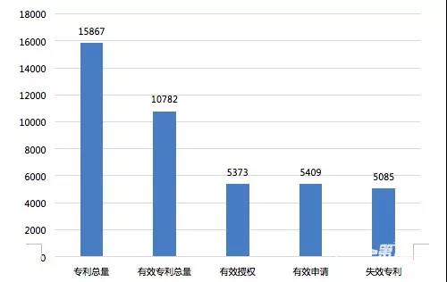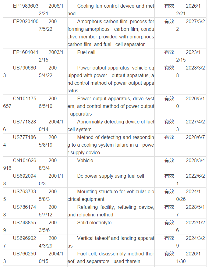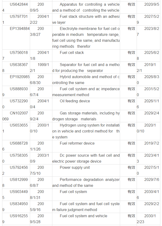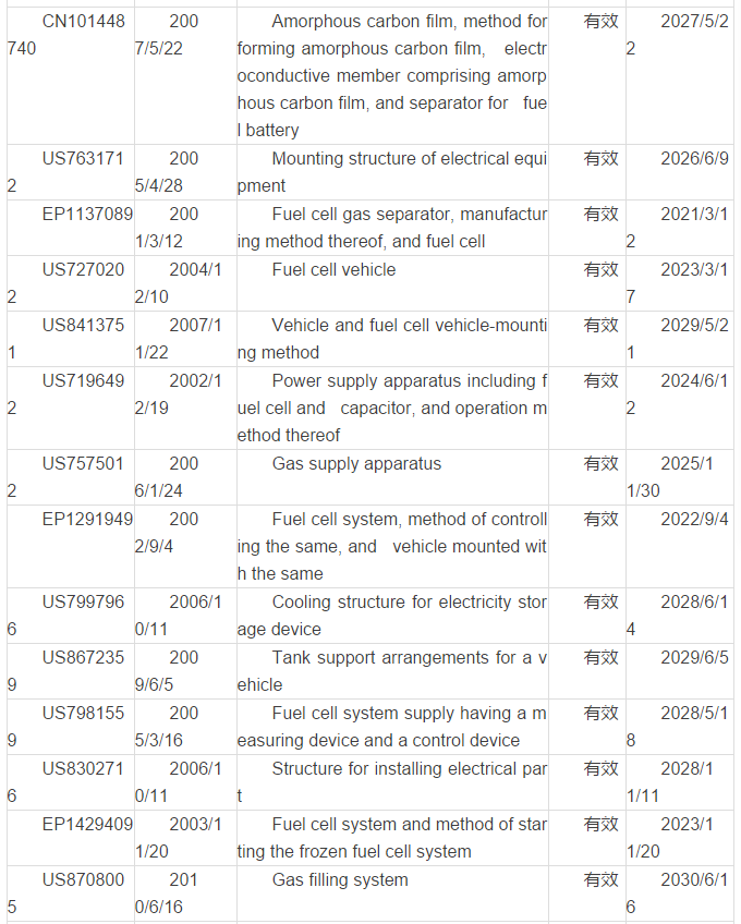下圖顯示,豐田汽車與燃料電池相關(guān)的專利總量為15867件,其中,10782件專利是有效的,包括5373件有效授權(quán)和5409件有效申請。豐田汽車失效專利數(shù)量較少,僅為5085件,占專利總量的32%。
