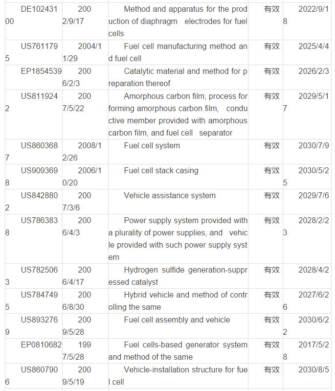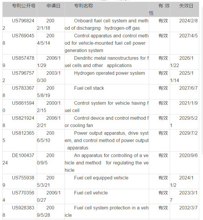 對豐田汽車的所有與燃料電池相關(guān)的專利族進(jìn)行專利強(qiáng)度分析,發(fā)現(xiàn)其專利強(qiáng)度超過90的專利有88件,涉及氫燃料電池控制系統(tǒng)、燃料電池堆、冷卻裝置、燃料電池制造等。88件專利全部有效,僅有3件專利將在2020年前失效。
