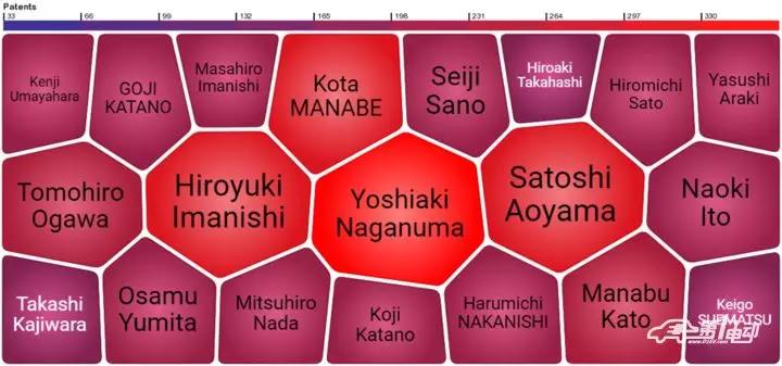 豐田汽車與燃料電池相關(guān)技術(shù)的高產(chǎn)發(fā)明人包括Yoshiaki Naganuma、Satoshi Aoyama、Hiroyuki Imanishi、Kota MANABE和Manabu Kato等,其中發(fā)明人包括Yoshiaki Naganuma的專利申請328件,占公司專利總量的2.1%。申請量排名前10發(fā)明人是公司技術(shù)研發(fā)核心團(tuán)隊(duì),申請專利1940項(xiàng),占公司專利總量的12.2%,說明公司科研團(tuán)隊(duì)龐大,科研人才較多。
