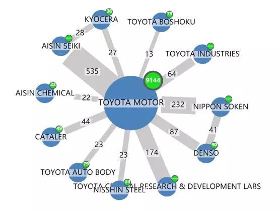 對豐田汽車申請的與氫能和燃料電池相關(guān)專利進(jìn)行申請人分析,其結(jié)果顯示了該企業(yè)與其他企業(yè)或個(gè)人的合作研發(fā)情況。由下圖可以看出,公司與愛信、Nippon Soken、豐田中央研發(fā)實(shí)驗(yàn)室等集團(tuán)內(nèi)外部企業(yè)和科研機(jī)構(gòu)有大量合作。技術(shù)的借鑒方面,本田汽車與氫燃料電池相關(guān)的專利被本田汽車、日產(chǎn)汽車、松下公司引用較多,同時(shí)也引用本田汽車、日產(chǎn)汽車、松下公司較多專利,豐田汽車與這三家公司之間的技術(shù)關(guān)聯(lián)度較高,互相引用、借鑒大量專利。