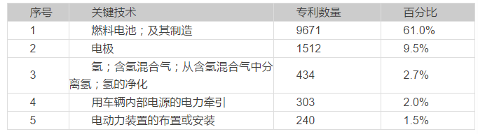 為了研究豐田汽車與氫能和燃料電池相關(guān)的技術(shù)研發(fā)情況,利用專利文本挖掘和IPC國際專利分類進(jìn)一步展開分析,可以看出該公司技術(shù)重點(diǎn)集中在氫泵、排水閥、電解質(zhì)膜、儲(chǔ)氫罐等技術(shù)。從IPC分類號來看,豐田汽車在H01M8燃料電池及其制造領(lǐng)域申請的專利數(shù)量最多,達(dá)到9671件,占總量的61%。專利申請數(shù)量第二多的技術(shù)領(lǐng)域是H01M4電極,占總量的9.5%。