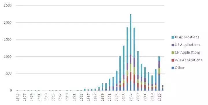截至2017年5月12日,豐田汽車已在21個(gè)國家和地區(qū)、2個(gè)國際知識(shí)產(chǎn)權(quán)組織申請了15867件與燃料電池相關(guān)的專利。2004年到2009年,豐田汽車與燃料電池相關(guān)的專利申請數(shù)量大幅增長,期間該技術(shù)領(lǐng)域年均專利申請量為1895件,說明豐田汽車在這幾年開展了大量氫燃料電池技術(shù)研究。2009年后,豐田汽車與燃料電池相關(guān)的專利申請數(shù)量逐漸下降,年申請量回落到500件左右。直到2014年,專利申請數(shù)量再度回升,2015年的專利申請量重新回到1000件以上,表明當(dāng)下豐田公司對燃料電池技術(shù)研究的熱情逐漸回升,未來可能有較多新技術(shù)和新產(chǎn)品面世。