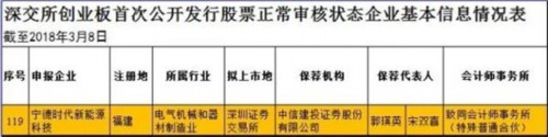 眾多投資者都在期待中國最大電池制造商寧德時代的上市,根據(jù)證監(jiān)會信息公開目錄,截至2018年3月8日,在當期《深交所創(chuàng)業(yè)板首次公開發(fā)行股票正常審核狀態(tài)企業(yè)基本信息情況表》中,寧德時代新能源科技有限公司在排隊名單中位列第119名(共139名)。