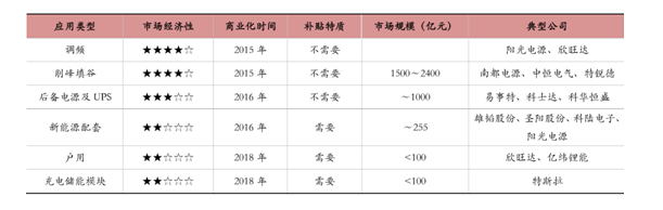 目前最具市場經(jīng)濟(jì)性的是傳統(tǒng)電網(wǎng)削峰填谷,已經(jīng)可以實(shí)現(xiàn)無補(bǔ)貼的商業(yè)化推廣,若“十 三五”期間在大型工業(yè)城市投資儲能項(xiàng)目,則市場規(guī)模有望達(dá)到 1500~2400 億元,此外,未來若在大型工業(yè)省份全面 推廣儲能,則市場規(guī)模更可觀;后備電源及 UPS 儲能也不需要補(bǔ)貼,市場規(guī)模約為 1000 億元;新能源發(fā)電可按一定 比例配套儲能,市場規(guī)模約為 255 億元,但尚需補(bǔ)貼;另外,戶用儲能和充儲放一體化充電站等市場規(guī)模不到 100 億 元,且需要補(bǔ)貼才能推廣。綜上所述,傳統(tǒng)電網(wǎng)削峰填谷將是未來五年最大的儲能市場。