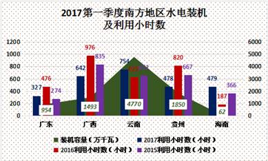 2017年第一季度,全國(guó)水電設(shè)備平均利用小時(shí)數(shù)623小時(shí),同比降低68小時(shí)。水電裝機(jī)容量超過1000萬千瓦的7個(gè)省份中,除云南外,其余省份水電設(shè)備平均利用小時(shí)數(shù)同比均有不同程度降低。
