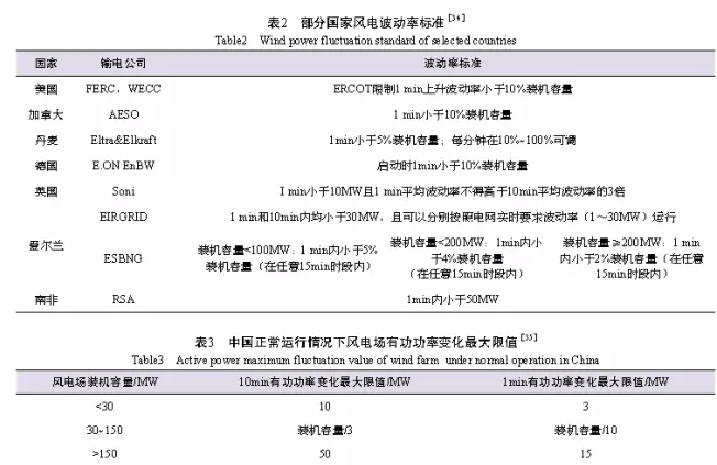 以上文獻只是單純地進行風(fēng)光出力波動的平抑,沒有考慮相關(guān)的優(yōu)化目標(biāo)或約束條件。目前對于風(fēng)光波動標(biāo)準(zhǔn)的制定,特別是在國內(nèi)還處于起步階段。最初風(fēng)電并網(wǎng)時,并未對風(fēng)電的功率波動制定相關(guān)標(biāo)準(zhǔn),隨著風(fēng)電裝機容量的增加,為了減少風(fēng)電波動對電網(wǎng)的影響,各國開始對風(fēng)電波動制定標(biāo)準(zhǔn),這主要體現(xiàn)在爬坡率上。不同國家的輸電公司或是電力部門對風(fēng)電爬坡率的要求有所不同。表2、表3分別是國外部分國家和中國對風(fēng)電波動率的相關(guān)要求。