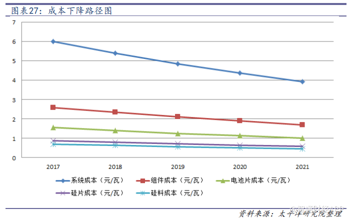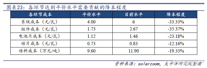 我們?nèi)?元/瓦的系統(tǒng)成本進(jìn)行測算,得出當(dāng)平價上網(wǎng)要求系統(tǒng)成本降到4元/瓦時,組件、電池片、硅片的成本分別需降到1.73、1.12、0.73元/瓦,而硅料成本需要降到9.6萬元/噸。未來組件、電池片、硅片和硅料環(huán)節(jié)需要貢獻(xiàn)的降本程度分為-35.37%、-23.18%、-12.16%及-19.33%。