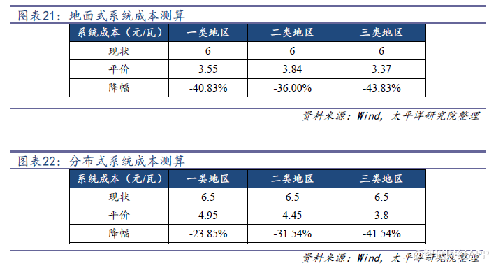 說明相對于地面式來說,分布式目前的系統(tǒng)成本水平更接近平價上網(wǎng)的標(biāo)準(zhǔn)。由于地面式電站大多建在一類二類地區(qū),而分布式電站大多建在二類三類地區(qū),所以我們得出滿足平價上網(wǎng)的系統(tǒng)成本區(qū)間在3.55-4.45元/瓦左右。