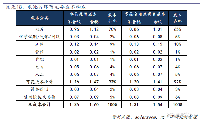 在組件環(huán)節(jié),主要的原材料成本包括電池片、玻璃、背板、EVA、鋁邊框、焊帶、接線盒、硅膠等,其他成本主要有人工成本和折舊成本。其中電池片成本占總成本比例為65%左右,是組件成本的最重要的組成部分。組件的降本途徑主要是通過提升單位面積內(nèi)的功率來實(shí)現(xiàn),比如現(xiàn)在比較普及的半片組件、疊片組件和雙面組件等。