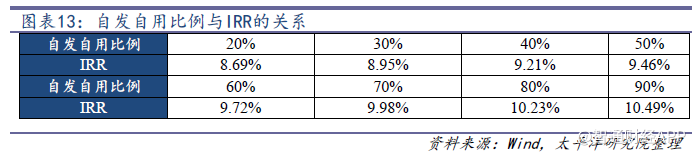 另外,我們以戶用分布式三類地區(qū)為例,測算不同自發(fā)自用比例對IRR的影響發(fā)現(xiàn),自發(fā)自用比例越高,電站的IRR也越高,兩者呈正向相關(guān)關(guān)系。
