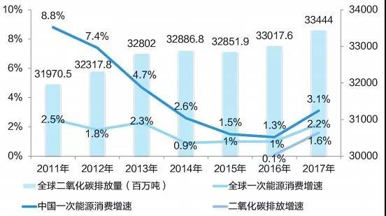 全球經(jīng)濟(jì)的復(fù)蘇也伴隨著能源需求的增長(zhǎng)。2017年全球能源需求增速為2.1%,超過其10年平均增速,約為2016年的2倍。盡管從長(zhǎng)遠(yuǎn)來看全球能源需求增速仍趨于放緩,但是從目前到2040年,全球能源總需求增幅仍將達(dá)到30%以上,特別是亞洲發(fā)展中國(guó)家的能源需求增幅占全球增幅的2/3以上。其中,化石燃料滿足了全世界超過70%的能源需求,盡管可再生能源發(fā)展迅猛,但是化石燃料仍會(huì)在未來30年中維持較為穩(wěn)固的主導(dǎo)地位。而化石燃料消費(fèi)的增長(zhǎng)也就不可避免地帶來了碳排放的增加,這也是世界經(jīng)濟(jì)復(fù)蘇帶來的必然結(jié)果。