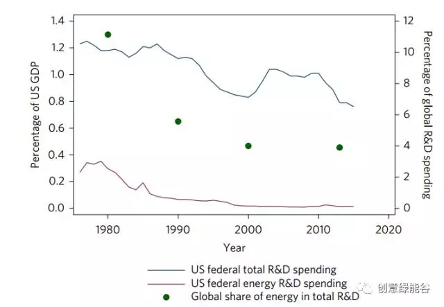 圖3美國聯(lián)邦政府在1976 - 2016年的研發(fā)支出。美國聯(lián)邦政府的研發(fā)支出在過去40年里下降了約1.2%至0.8%。與此同時,與能源相關(guān)議題的聯(lián)邦研發(fā)支出從0.3%驟降至0.013%。這些深綠色的圓點顯示了與能源相關(guān)的研發(fā)支出在研發(fā)支出中所占份額的相似發(fā)展。在20世紀(jì)70年代后期,能源研發(fā)占研發(fā)總量的10%以上,其中50%以上被分配到全球核能。相比之下,2013年國際社會將3.9%的研發(fā)資金投入與能源相關(guān)的活動。數(shù)據(jù)來自美國科學(xué)促進會。