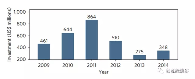 圖4全球企業(yè)和風(fēng)險投資在能源存儲領(lǐng)域的投資。在金融危機后的2009年、2010年和2011年,投資水平在2014年大幅下降。