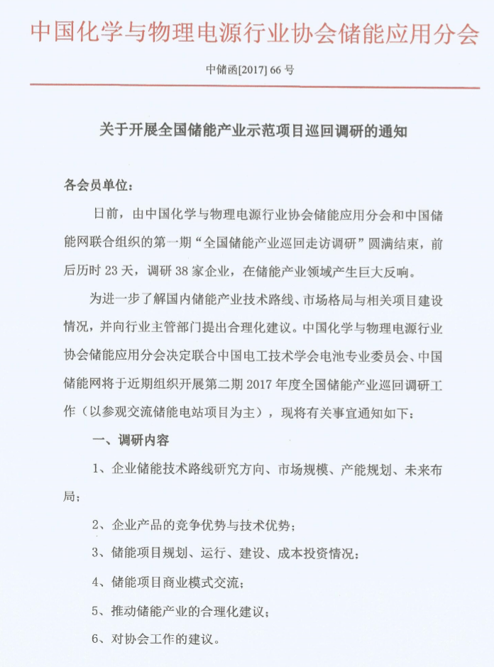 為進(jìn)一步了解國內(nèi)儲(chǔ)能產(chǎn)業(yè)技術(shù)路線、市場格局與相關(guān)項(xiàng)目建設(shè)情況,并向行業(yè)主管部門提出合理化建議。中國化學(xué)與物理電源行業(yè)協(xié)會(huì)儲(chǔ)能應(yīng)用分會(huì)決定聯(lián)合中國電工技術(shù)學(xué)會(huì)電池專業(yè)委員會(huì)、中國儲(chǔ)能網(wǎng)將于近期組織開展第二期2017年度全國儲(chǔ)能產(chǎn)業(yè)巡回調(diào)研工作(以參觀交流儲(chǔ)能電站項(xiàng)目為主),現(xiàn)將有關(guān)事宜通知如下: