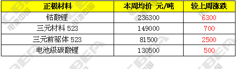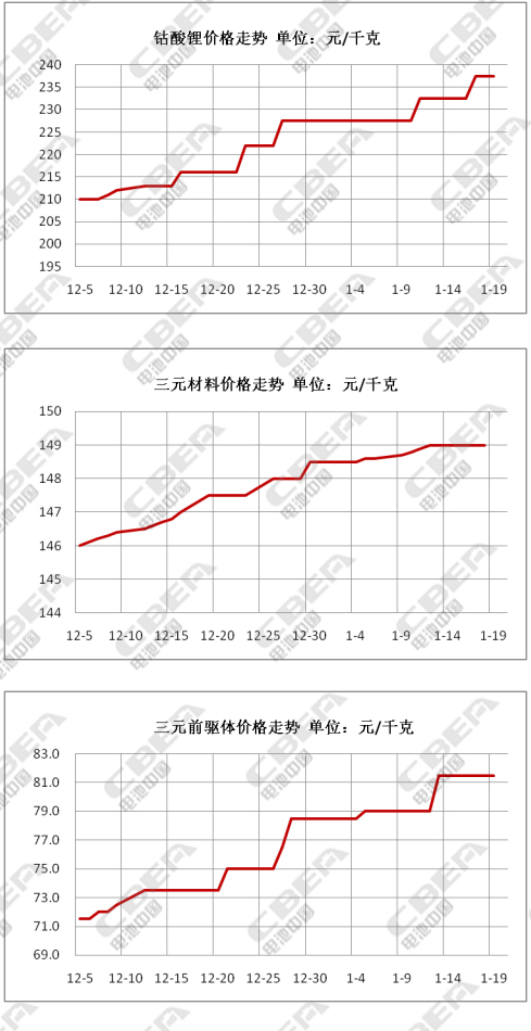 本周鈷酸鋰、三元材料及碳酸鋰價(jià)格整體呈現(xiàn)上漲態(tài)勢,主要是由于近期原料市場成本加速上漲,生產(chǎn)廠家成本增加,迫使廠家不得不上調(diào)報(bào)價(jià),但下游采購商對(duì)高報(bào)價(jià)持觀望態(tài)度,致使整體成交情況一般,近期多以交付前期訂單為主。目前,鈷酸鋰市場主流價(jià)格在23.5-24萬元/噸,均價(jià)較上周上漲6300元/噸;三元材料價(jià)格本周上漲700元/噸,市場主流報(bào)價(jià)在14.5-15.3萬元/噸;三元前驅(qū)體本周報(bào)價(jià)在8-8.3萬元/噸,均價(jià)較上周上漲2500元/噸;市場上新單成交放量有限,部分生產(chǎn)商基本已進(jìn)入春節(jié)前檢修期。