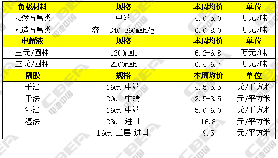 本周負(fù)極材料市場繼續(xù)保持平穩(wěn)運(yùn)行。目前低端負(fù)極材料主流報(bào)價(jià)1.8-2.2萬元/噸,中端產(chǎn)品主流報(bào)價(jià)4-5.5萬元/噸,高端產(chǎn)品主流報(bào)價(jià)8-10萬元/噸;受電芯廠春節(jié)前停產(chǎn)整修的影響,市場出貨量略有減少。