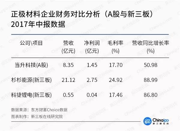 如果對(duì)分類財(cái)務(wù)指標(biāo)進(jìn)一步分析,可以發(fā)現(xiàn),新三板的杉杉能源全面勝出,無(wú)論是營(yíng)收還是凈利潤(rùn),亦或是毛利率和成長(zhǎng)性,均高出A股上市公司當(dāng)升科技。