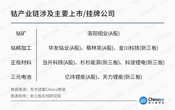 而國(guó)內(nèi)來(lái)說(shuō),精煉鈷的主要公司有華友鈷業(yè)(A股)、格林美(A股)、金川科技(新三板)。其余中下游如正極材料和三元電池也都出現(xiàn)了A股和新三板公司的身影。