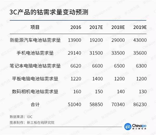 根據(jù)IDC相關(guān)預(yù)測(cè),2017-2019年,手機(jī)產(chǎn)品的鈷需求量分別為3.15萬(wàn)噸、3.35萬(wàn)噸、3.56萬(wàn)噸;筆記本電腦的鈷需求量分別為0.66萬(wàn)噸、0.65萬(wàn)噸、0.63萬(wàn)噸;平板電腦的鈷需求量依次為0.14萬(wàn)噸、0.12萬(wàn)噸、0.12萬(wàn)噸;數(shù)碼相機(jī)的鈷需求量分別為150噸、140噸和130噸。