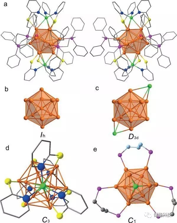 b-e)從Au13(b)的Ih到Au13Cu2(c)的D3d到Au13Cu2(SPy)6(d)的C3到[Au13Cu2(DPPP)3(SPy)6]+(e)的C1的對稱破裂。橙色代表Au,綠色代表Cu,粉紅代表P,黃色代表S,藍(lán)色代表N,灰色和淡藍(lán)色代表C。為了清晰起見,省略了所有的氫原子。