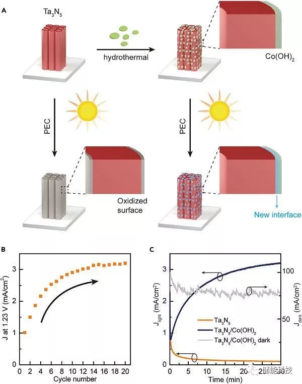 (A) 示意圖表明氮化鉭本身在光氧化水條件下的自氧化以及在沉積了氫氧化鈷后在光氧化水條件下形成新的界面。(B)沉積了氫氧化鈷后氮化鉭的光電流密度隨著循環(huán)伏安次數(shù)的增加而升高。類似的現(xiàn)象在電流密度-時間的曲線中也可以觀察到,見(C)。
