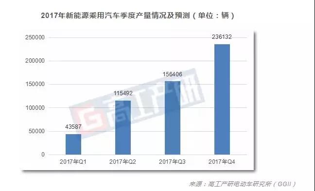 中國儲(chǔ)能網(wǎng)訊:從2017年,我國新能源汽車產(chǎn)量季度走勢(shì)來看,從一季度到四季度產(chǎn)量逐漸走高,其中第四季度產(chǎn)量更是接近一季度的近八倍。