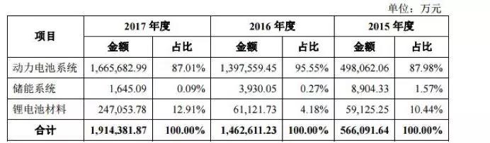 數(shù)據(jù)顯示,2015-2017年,寧德時代鋰電池材料收入分別為5.91億元、6.11億元和24.7億元。分別占據(jù)總營收的10.44%、4.18%和12.91%。
