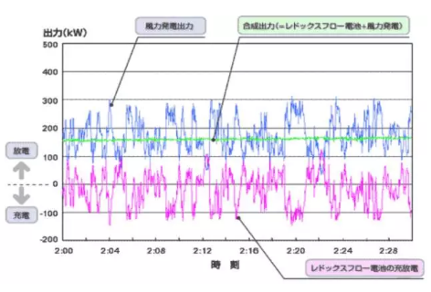 舉一個例子,上圖是日本的某個實驗:圖中曲線是某風(fēng)機(jī)半夜兩點時段的發(fā)電輸出,可以看到這個風(fēng)力發(fā)電不是那么穩(wěn)定,最高超過300千瓦,最低不到50千瓦。這是風(fēng)機(jī)發(fā)電的特點,可能會對電網(wǎng)造成很大的問題。但如果有儲能裝置,發(fā)電多時將多余電存起來作為負(fù)載,發(fā)電少時往外放電,長此以往,計算出一個預(yù)估值,判斷多大風(fēng)發(fā)多少電,根本解決風(fēng)能、太陽能發(fā)電的不穩(wěn)定、不連續(xù)性特性,實現(xiàn)安全、穩(wěn)定供電。