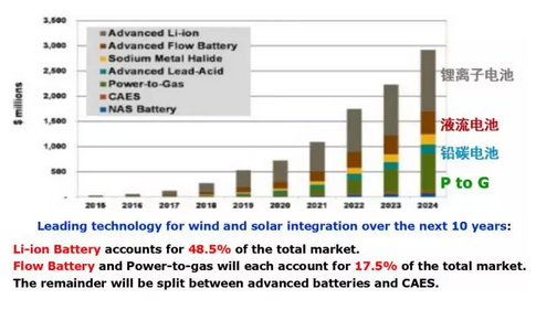 上圖是一個叫Navigant的咨詢公司2015年對儲能技術(shù)的預(yù)測。上圖顯示了該公司認(rèn)為的今后哪些儲能會主導(dǎo)。具體的百分比我不太相信,但其趨勢我比較認(rèn)可。除了鋰離子、液流電池、歐洲還有一個P to G(Power-to-Gas)技術(shù)。我個人認(rèn)為,從中期看,儲能的這三種技術(shù)是比較好的。