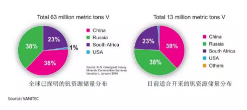 全球目前已知的資源儲量大約6300萬噸釩,中國釩儲量占世界38%;其中適合目前開采的資源儲量為1300萬噸釩,95%在中國、俄羅斯和南非。