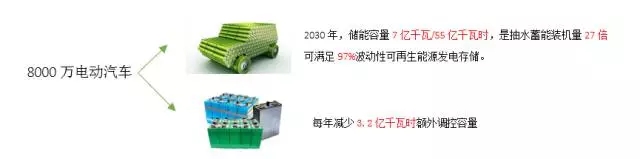 一是車載電池,按照2030年全國電動汽車保有量達(dá)到8000萬輛的預(yù)測,電動汽車每年充電需求將達(dá)到4100億千瓦時,理論儲能容量達(dá)到7億千瓦/55億千瓦時,其功率儲能的容量約為目前全國抽水蓄能裝機(jī)量的27倍。2030年風(fēng)電,光伏發(fā)電電量將達(dá)到42.1億千瓦時,則僅電動乘用車的有效儲能容量即可滿足97%波動性可再生能源日發(fā)電量的存儲,如果電動汽車能夠有序充放電,則可以減少額外投資而獲得的巨大調(diào)控容量。