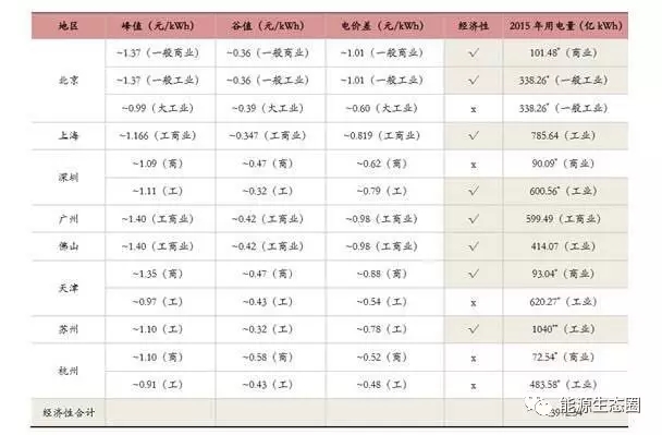 特別是部分工商業(yè)發(fā)達(dá)的大型城市,統(tǒng)計(jì)了國(guó)內(nèi)大型城市的峰谷電價(jià)差,根據(jù)目前鉛炭?jī)?chǔ)能最 低 0.5 元左右的度電成本,電價(jià)差大于 0.8 元/kWh 的地區(qū)都有經(jīng)濟(jì)性,這些地區(qū)對(duì)應(yīng)的 2015 年用電量合計(jì)約 為 3972.54 億 kWh,若其中 10%的用電量通過(guò)儲(chǔ)能來(lái)進(jìn)行削峰填谷,大約需要 1.2 億 kWh 的儲(chǔ)能設(shè)備(其容量對(duì)應(yīng)日 充放電量) ,若按鉛炭?jī)?chǔ)能每 kWh 約 1250 元的投資額計(jì)算,則對(duì)應(yīng)累計(jì)市場(chǎng)規(guī)模 1500 億元;若按鋰電儲(chǔ)能每 kWh 約 2000 元(考慮未來(lái)五年成本有望明顯下降)的投資額計(jì)算,則對(duì)應(yīng)累計(jì)市場(chǎng)規(guī)模 2400 億元。