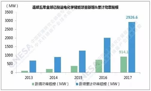 據(jù)儲能聯(lián)盟的不完全統(tǒng)計(jì),截至2017年底,全球已投運(yùn)儲能項(xiàng)目累計(jì)裝機(jī)規(guī)模為175.4GW。其中,抽水蓄能的累計(jì)裝機(jī)占比最大,為96%,較上一年下降1個(gè)百分點(diǎn)。電化學(xué)儲能項(xiàng)目的累計(jì)功率規(guī)模為2926.6MW,占比1.7%,較上一年增長0.5個(gè)百分點(diǎn)。2017年,全球新增投運(yùn)電化學(xué)儲能項(xiàng)目的功率規(guī)模為914.1MW,同比增速超過20%。