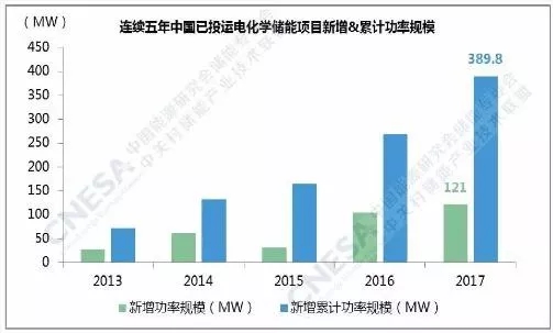 據(jù)儲能聯(lián)盟的不完全統(tǒng)計(jì),截至2017年底,中國已投運(yùn)儲能項(xiàng)目累計(jì)裝機(jī)規(guī)模為28.9GW。其中,抽水蓄能的累計(jì)裝機(jī)占比最大,接近99%,電化學(xué)儲能項(xiàng)目的累計(jì)裝機(jī)規(guī)模緊隨其后,為389.8MW,占比為1.3%,較上一年增長0.2個(gè)百分點(diǎn)。2017年,中國新增投運(yùn)電化學(xué)儲能項(xiàng)目的功率規(guī)模為121MW,同比增速超過15%。