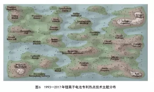 利用ThomsonInnovation平臺的專利地圖功能,結(jié)合專利分類號的分析,我們對鋰離子電池、鈉硫電池、液流電池及鉛酸電池專利技術(shù)熱點進行了分析。圖6為鋰離子電池的專利熱點技術(shù)地圖,可以看出,鋰離子電池專利的熱點技術(shù)主題包括:(1)聚合物電解質(zhì);(2)正極、負極氧化物材料研究;(3)儲能、電動汽車及圖像處理技術(shù)應(yīng)用;(4)充放電研究;