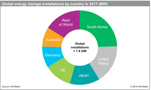 IHS Markit公司預(yù)計2018年還將在全球部署3GW的儲能容量,比2017年HIS公司預(yù)測的1.9GW儲能部署量有所增加。其中有40%是電網(wǎng)側(cè)儲能項目,而這些項目中,電池儲能系統(tǒng)與太陽能電池部署在一起。