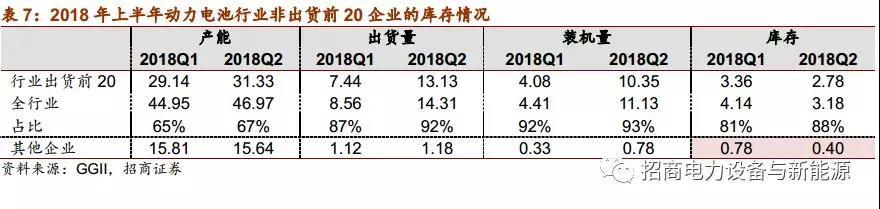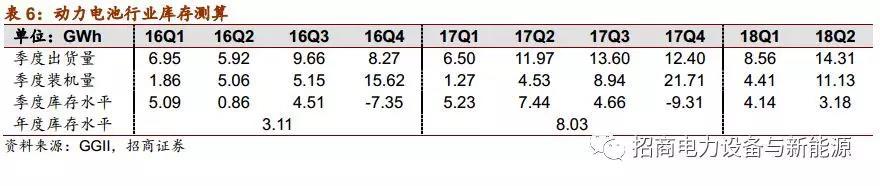 2.動力電池庫存已經(jīng)降低到合理水平:Q1、Q2分別出產(chǎn)約4.2和3.2GWh的動力電池,若考慮2017年的庫存,6月底產(chǎn)業(yè)鏈將共有15.5GWh電池庫存,值偏較大。但剔除儲能、非工信部發(fā)放合格證的車輛裝機、外圍企業(yè)無效庫存、沃特瑪庫存后,6月底有效的庫存約6-7GWh,屬于比較合理的水平。