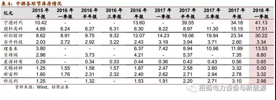 上半年中游數(shù)據(jù)與終端持續(xù)背離,主要原因在于中游總體處在去庫存過程,而庫存以多重身份存在,上至電池材料的原材料采購和半成品,下到整車廠原材料項目中的電池庫存。從報表上看,也可以印證:2018年Q1中游各環(huán)節(jié)主要企業(yè)庫存絕對值、庫存營收比幾乎都創(chuàng)歷史新高。