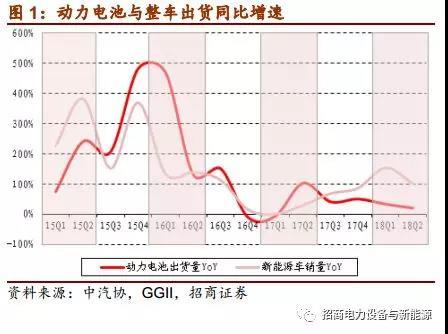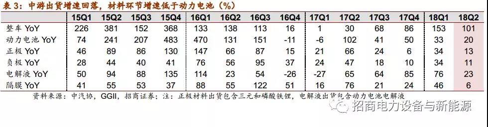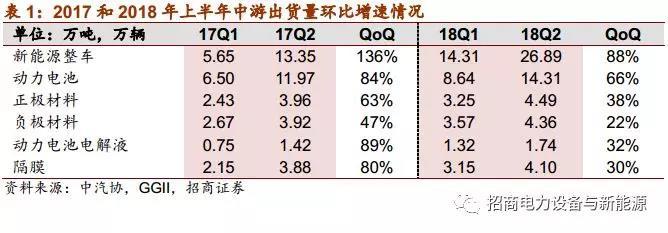 第二,2017年的基數(shù)較高。2017年年初由于補貼及推廣目錄政策變更,整車銷售基本停滯,但產(chǎn)業(yè)預(yù)期Q2企業(yè)將逐漸適應(yīng)新政策并開始放量(事實上Q2確實放量,整車銷售同、環(huán)比增長約30%、136%,下半年銷量持續(xù)攀升),因而中游產(chǎn)業(yè)鏈從Q1末便已經(jīng)進入排產(chǎn)旺季,帶動Q2產(chǎn)銷兩旺(Q2動力電池出貨同、環(huán)比增長約102%、84%)。