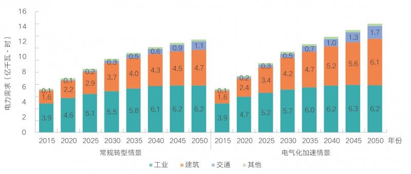 電力需求仍將保持較快增長,飽和時點相比于能源需求延后10-15年,2050年電力需求將在當前水平基礎(chǔ)上翻番,人均電力消費達到8800-10300千瓦時。工業(yè)部門用電占比逐步下降,2050年仍是最主要的電力消費部門,建筑部門用電占比快速提高。