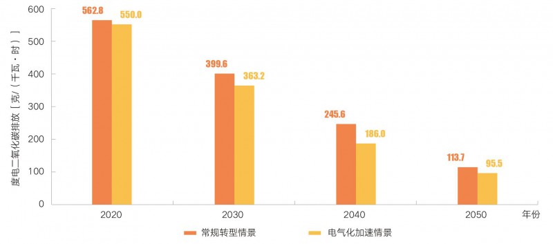 隨著清潔能源發(fā)電量占比逐漸提升,電力行業(yè)碳排放總量在2025年前后出現(xiàn)峰值,2050年單位電量碳排放強度將降至當前水平的20%以下。