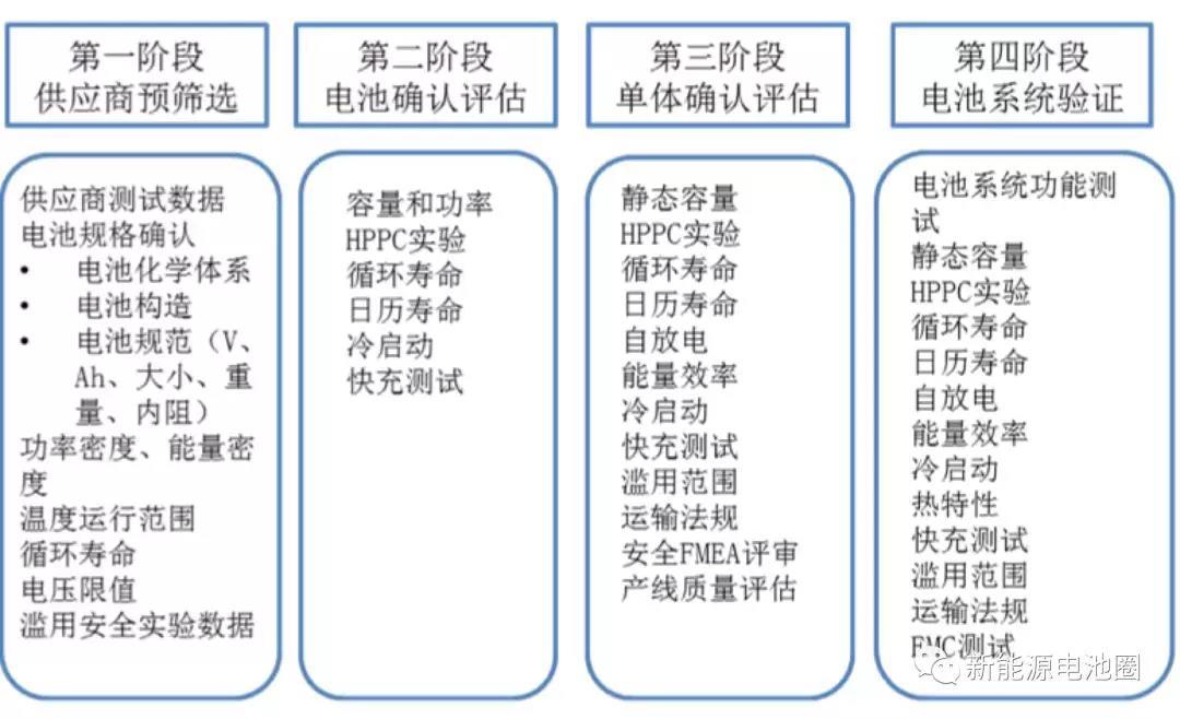 上汽集團(tuán)共把它分為四個(gè)階段:預(yù)篩選-電池確認(rèn)和評(píng)估-單體確認(rèn)和評(píng)估-系統(tǒng)驗(yàn)證。各個(gè)階段都有嚴(yán)格的測(cè)試流程和控制。