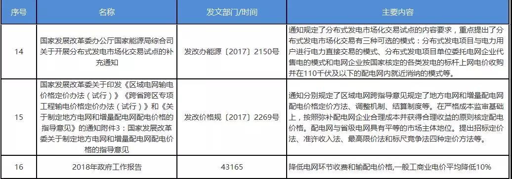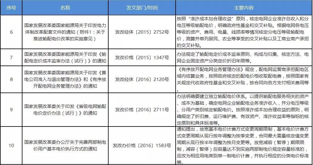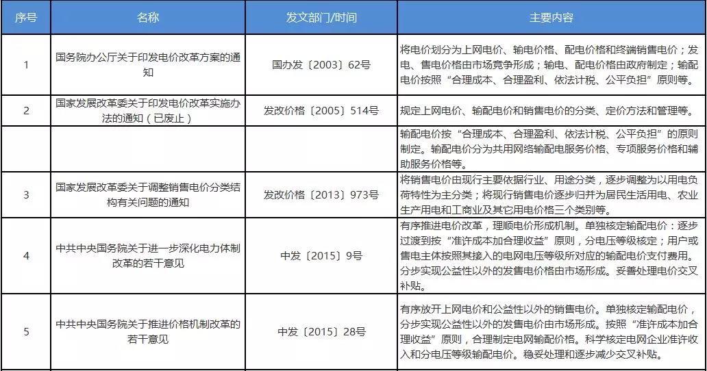 1.輸配電價改革正按照“管住中間、放開兩頭”的電價改革總體思路不斷深化?!秶鴦赵恨k公廳關(guān)于印發(fā)電價改革方案的通知》(國辦發(fā)〔2003〕62號)明確規(guī)定了輸配電價改革的原則和方向,給后續(xù)政策制定奠定了堅實基礎(chǔ)?!吨泄仓醒雵鴦赵宏P(guān)于進一步深化電力體制改革的若干意見》(中發(fā)〔2015〕9號)進一步將電價改革作為首要任務,明確提出單獨核定輸配電價,按“準許成本加合理收益”原則,分電壓等級核定等要求。