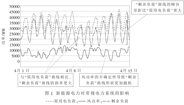 確保安全、高質(zhì)量供電,同時維持電力供需平衡是電力系統(tǒng)面臨的持續(xù)挑戰(zhàn)。社會的用電需求是實時變化的,晝夜和季節(jié)性用電負(fù)荷存在峰谷差,而電力供需平衡的常規(guī)調(diào)節(jié)方式是通過改變發(fā)電機(jī)組的出力來適應(yīng)需求變化。在役發(fā)電機(jī)組可分兩類:承擔(dān)基本負(fù)荷的機(jī)組(下稱:基荷機(jī)組)和變負(fù)荷機(jī)組?;蓹C(jī)組的出力基本維持不變,而變負(fù)荷機(jī)組的出力則隨需求的變化而變化。為分析新能源電力對常規(guī)電力系統(tǒng)的影響,將新能源發(fā)電量視為所減少的用電負(fù)荷,此時常規(guī)發(fā)電機(jī)組需要提供的電量等于原用電負(fù)荷減去新能源機(jī)組的發(fā)電量,文中定義為“剩余負(fù)荷”。對比“原用電負(fù)荷”和“剩余負(fù)荷”曲線,可說明新能源電力對常規(guī)電力系統(tǒng)的影響。圖1是美國Texas州某地區(qū)2005年的雙周用電負(fù)荷與風(fēng)力發(fā)電數(shù)據(jù)[1]。